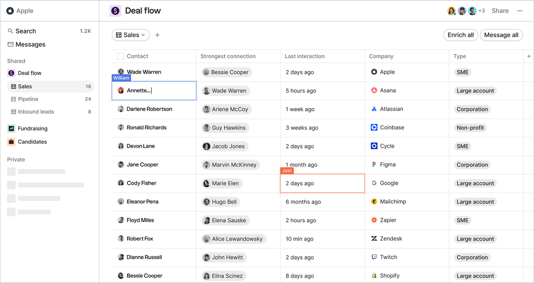 folk transforms networking into a team sport, allowing groups to manage, share, and grow relationships together. Unlike most personal CRMs that silo contact data, folk enables shared contact access across teams. Members can tag each other, share notes, and coordinate follow-ups without losing context.