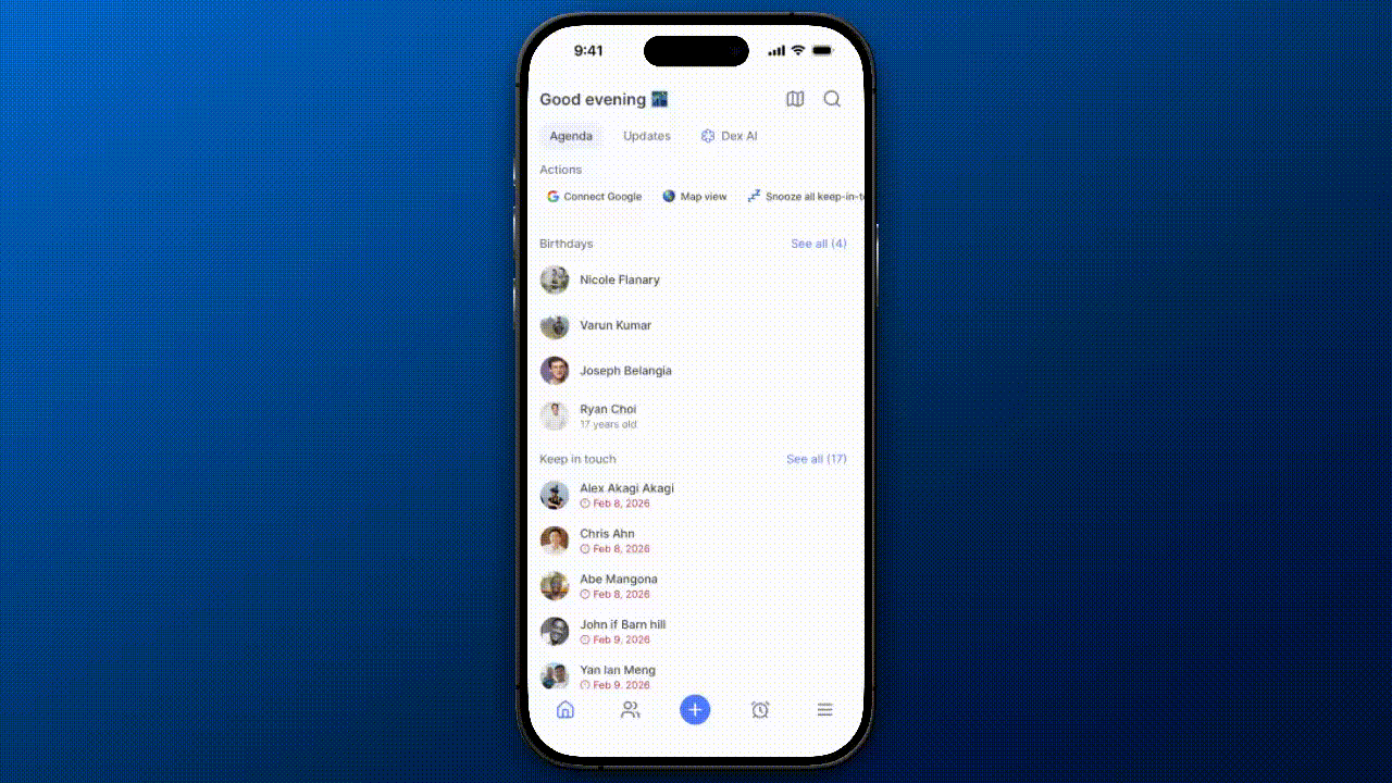 By combining social, email, and calendar integrations with smart reminders and AI-assisted prompts, Dex helps you remember why a relationship matters and when to act, directly from your phone. Instead of reacting to missed messages or forgotten follow-ups, Dex makes relationship maintenance feel intentional and manageable, even as your network grows.