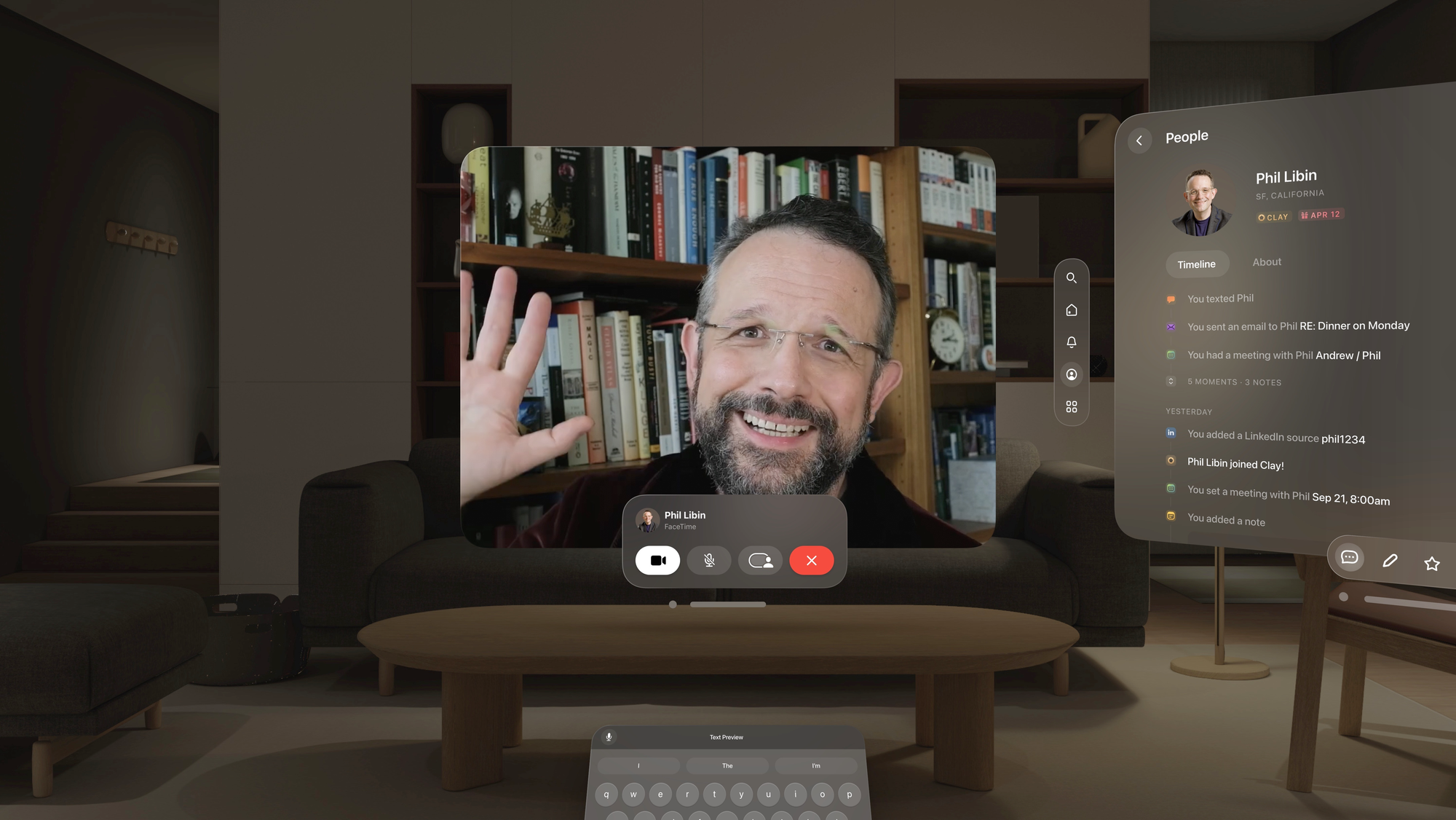 Clay is one of the few personal CRM tools to bet on spatial computing. The Clay for Apple Vision Pro app reimagines the entire experience for visionOS, letting you browse, explore, and interact with your network in three dimensions. Every part of Clay has been redesigned for the Vision Pro environment, from navigation to contact cards to relationship visualization.