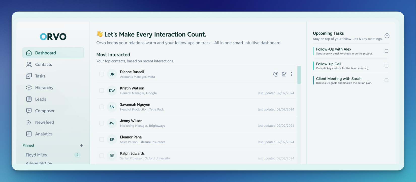 Orvo is a personal CRM platform designed to help individuals and teams organize, track, and nurture relationships more intelligently. It combines contact management with AI-powered insights to make follow-ups more natural, timely, and effective. Whether you’re managing your personal network or coordinating with a team, Orvo helps you build genuine connections that last.