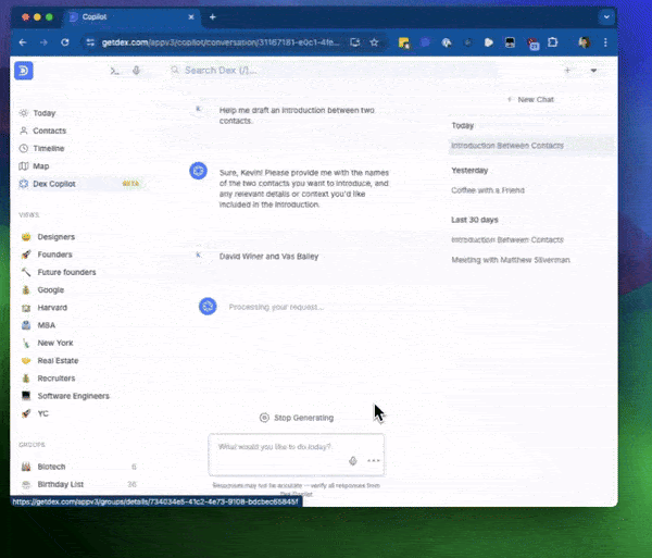 All users now have access to an early version of our AI Copilot; bringing together the power of large language models with your network in Dex. Before announcing this feature, we’d love for you to try Dex Copilot and share feedback on how the feature works for you. There’s a lot that Copilot can do already, and much more we’d like to do - your feedback will be invaluable in shaping future direction.