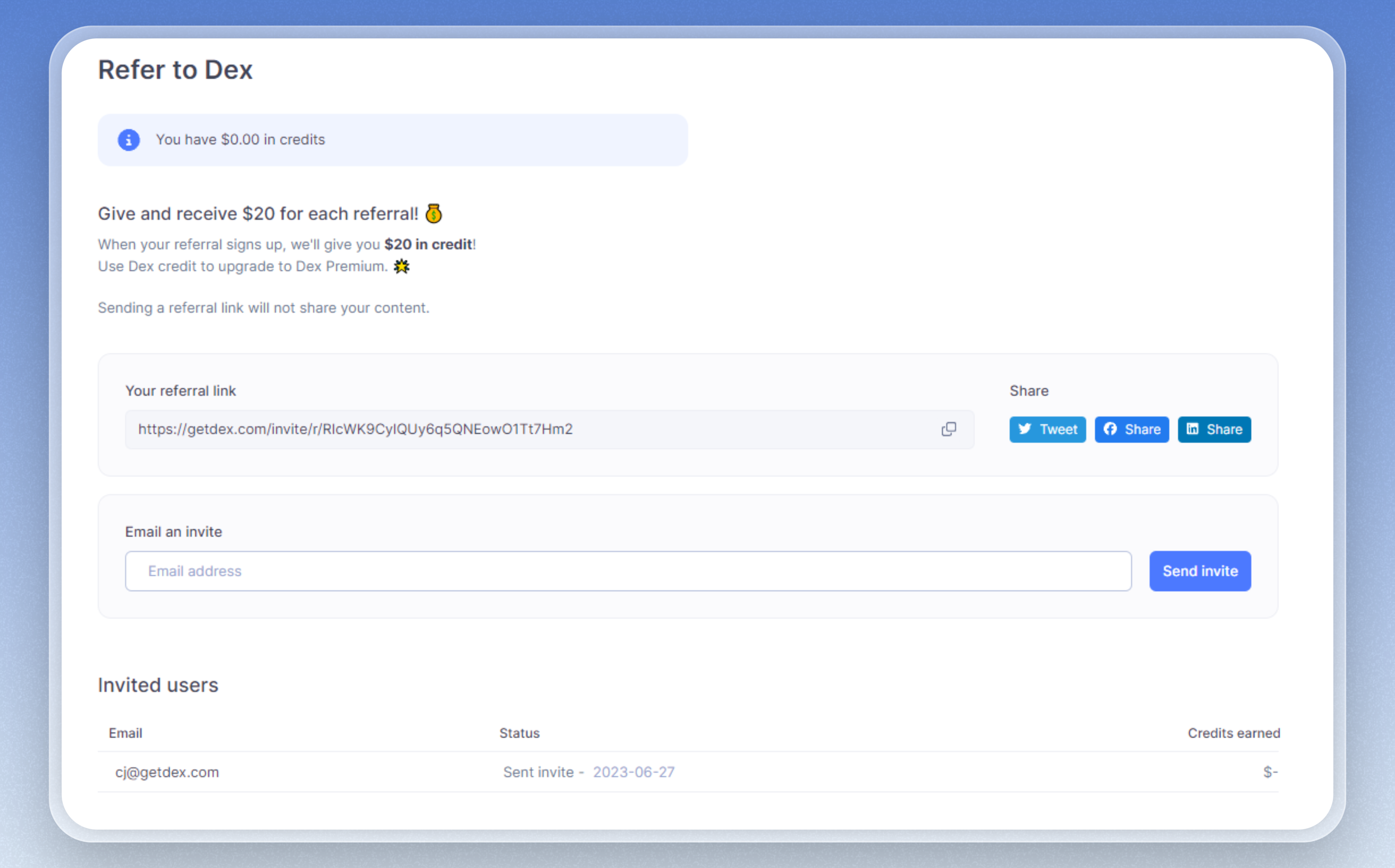 You can go to the Referral page through the drop-down menu and clicking on βRefer to Dexβ.