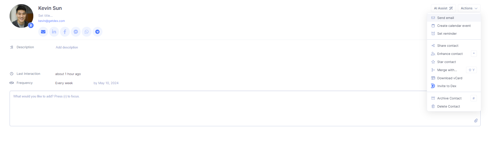 After drafting a message, click the ‘Compose in email client’ button to open your email client of choice.You can also send an email from the contact’s card by going to ‘Actions’ > ‘Send email’: