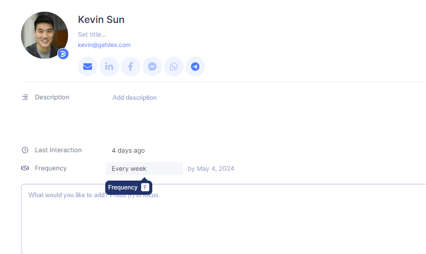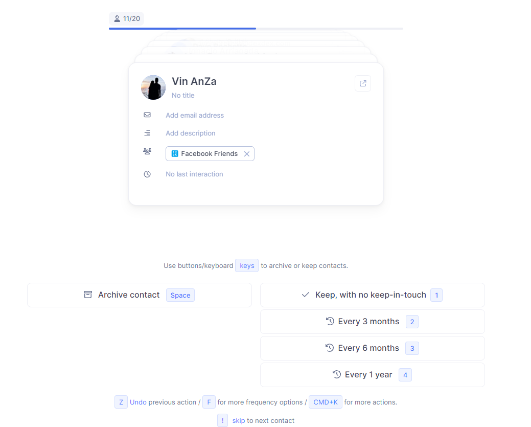 From the contactβs profile, you can also set (F), snooze (H), or update the Keep-in-touch reminder.