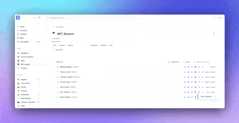 Build Dex views around your strategy: Use filters and tags in Dex to group contacts by industry or geography, for example, “MIT Alumni” or “Apple Software Designers.” Create a wishlist group: Add companies you’re excited about, then populate it with relevant contacts—employees, recruiters, alumni, etc.