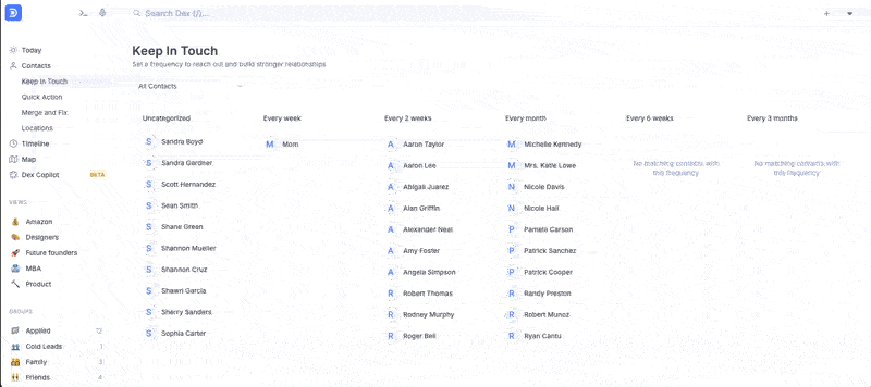 Dex recommends using the Keep-in-Touch page when you’re setting up frequencies for multiple contacts. From there, it’s a simple drag and drop. You can also organize reminders by Group.
