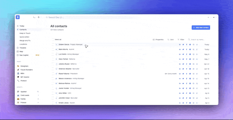 Dex can help. Use Dex’s contact import feature to pull in relationships from LinkedIn, Gmail, your calendar, and more. It automatically de-duplicates and merges profiles so you have a clean slate. You don’t need to sort everyone immediately. Just start with centralization.