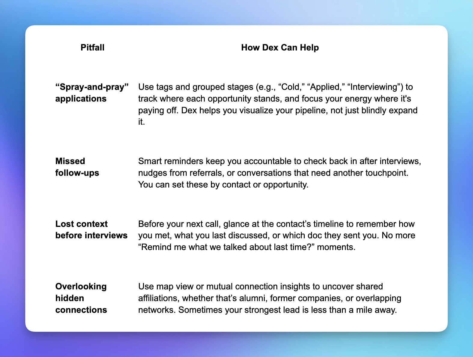 Below are some common challenges job seekers face, along with how Dex can help you sidestep them: